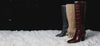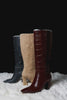 Brown textured background overlayed with a  model wearing the Gylina Knee High Boot in Whiskey